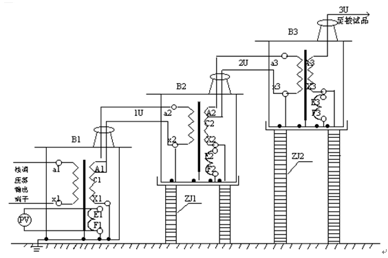 图3:三台高压试验变压器串激工作原理示意图 1、做工频耐压试验使用接线方法见图5。做工频耐压试验前,先根据试验变压器的额定容量选择好限流电阻,(水电阻)的阻值,再根据被试品需加的高压电压值调整好放电球隙的球间距,为了提高对被试品施加电压的测量精度,应在高压侧接入FRC阻容分压器来测量电压。