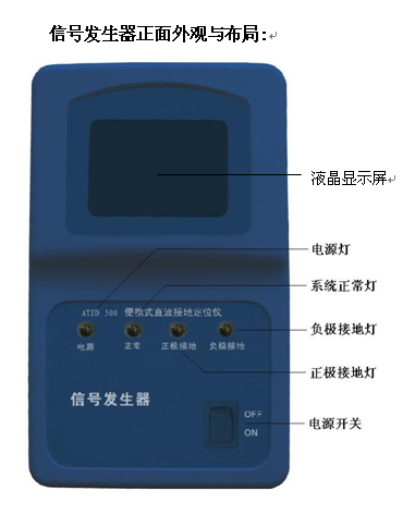 “电源"灯亮 说明信号发生器已开启。 “正常"灯亮 说明系统无接地故障。 “正极接地"灯亮 说明系统发生正极接地故障。 “负极接地"灯亮 说明系统发生负极接地故障。 “开关"按键 信号发生器的电源开关键 信号发生器背面与布局: