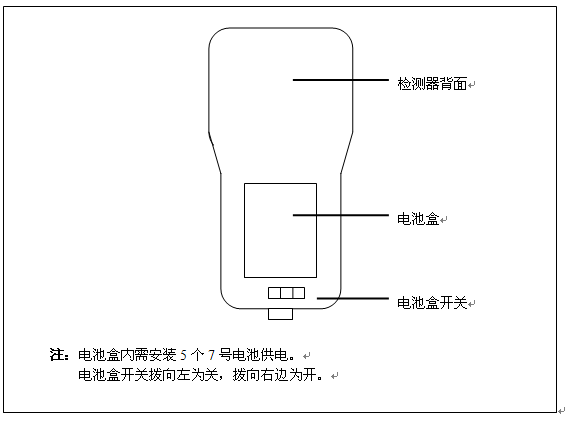 “电源灯"灯亮 说明检测器已开启。 “电源"按键 是检测器的电源开关键。 “功能切换"按键 是检测器在功能选择界面下的“快速检测" 、“完整检测" 和“在线检测"三个功能之间的切换键。任何时候按功能键,跳转到功能选择界面。 “检测"按键 当检测器选定其中一种检测功能时,每按一次“检测"键,检测器就进行一次新的测试。 检测器背面与布局: