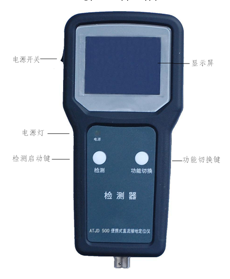 说明: 滑动开关位置位于: 左(1档):信号发生器处于自动监测功能,时刻对直流系统进行监测并及实时更示系统相关参数的显示。主要用途是查找系统出现一般性接地故障。信号强度为1.4mA 。 中(2档):信号发生器处于自动监测功能,时刻对直流系统进行监测并及实时更示系统相关参数的显示。主要用途是查找系统出现一般性接地故障。(该档为出厂默认设置)信号强度为6mA 。 右(3档):信号发生器处于接地故障自锁定功能,当直流系统一经出现接地故障,发生器只对系统进行一次分析后,自动锁定状检测结果和发送信号状态,不对系统参数的变化进行跟踪。主要用途是查找系统的间歇性接地和接地阻抗频繁跳变等特殊接地故障。信号强度为6mA。 5.1.2 检测器的外观与布局: 检测器正面外观与布局: