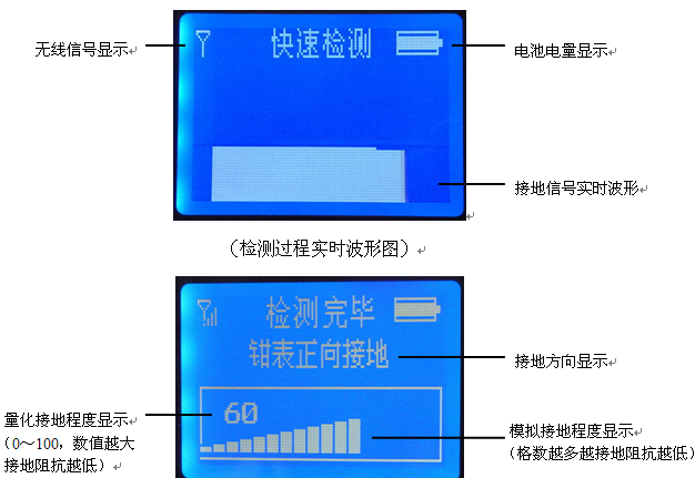 (直流系统发生正极28KΩ时信号发生器显示界面) 5.2.1 检测器液晶屏显示界面: 当被检测的回路(支路)无接地故障时,检测测器显示界面如下图: 如选择“快速检测"功能,当被检测的回路(支路)有接地故障时,检测测器显示界面如下:(其中,如显示“钳表正向接地"表示接地故障点与钳表标示箭头方向*,如显示“钳表反向接地"表接地故障点与钳表标示箭头方向相反)