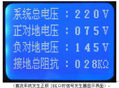 (直流系统无接地故障时信号发生器显示界面) 直流系统有接地故障时,信号发生器自动判断接地故障极性。如系统正接地,信号发生器“正极接地"指示灯亮,如系统负接地,“负极接地"指示灯亮,同时液晶显示屏显示系统母线电压、正极对地电压、负极对地电压、系统对地绝缘总阻抗。显示界面如下图: