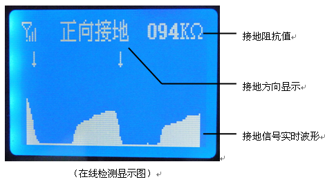 如选择“在线检测"功能,检测器将不停的扫描回路(支路)接地情况,用以对较复杂回路情况进行判断。