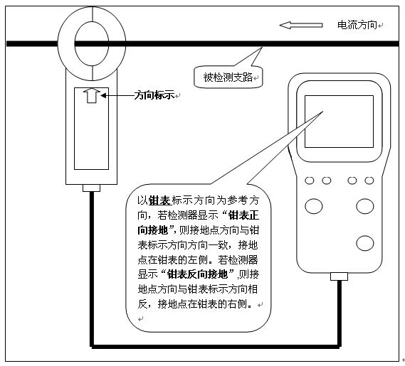 6.1 设备使用前的准备 6.1.1检查检测器的电池:由于装置使用时间间隔较长,容易造成电池电量不足,影响检测准确性,甚至使检测工作无法正常进行,因此在使用装置前请检查电池的电量是否满足工作要求,否则请更换电池。 6.1.2把钳表输出电缆与检测器连接,开启检测器,以检验钳表与检测器联接状况,如钳表上“电源"灯亮,表示钳表与检测器联接正常,否则请检查电缆接接头是否已正确、可靠地接在检测器上。 6.1.3把信号发生器连接入直流系统。信号发生器通过三芯电缆正确、可靠地连接在系统母线靠近蓄电池侧。 注:信号发生器信号连接线:红夹子(褐色线)接系统母线正极,黑夹子(蓝色线)接系统母线负极,黑夹子(黄绿色线)接系统地线。确认发生器正确并可靠地与系统连接好。 6.1.4在使用LYDCS-3300前建议关闭直流系统正在运行的在线接地监测装置,这样更有利于接地故障的准确、快速定位。 6.2 设备的使用操作 当直流系统发生接地故障时,打开信号发生器电源开关,此时信号发生器自动适应系统电压等级,分析系统绝缘状况,并把分析结果通过液晶显示屏和LED灯分别显示,此时再利用检测器依次对各个可能的支路进行检测,直到定位出所有接地故障点为止。 使用检测器进行接进故障定位操作方法及实例介绍。 6.2.1 检测器上的钳表钳在被测回路(支路)时,请确认钳表口已完全闭 合,否则会影响检测结果的准确性。由于钳表精度非常高,钳好被测回路后,请待钳表静止后再按动检测器的“检测"键开始检测。 6.2.2 钳单根:当正、负极电缆不能同时被钳表钳住时,采用“钳单根" 的检测方法,如是正极接地,将钳表钳在正极电缆上,再按一下检 测器上的“检测"键进行检测,如是负极接地,则钳在负极电缆上, 再按一下检测器上的“检测"键进行检测。 对电缆进行接地故障进行检测时,接地方向判别如下图: