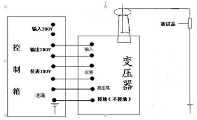 为单相变压器,联结组标号II。单台变压器的工作过程,用交流220V(10KVA以上为380V)电压接入电源控制箱(台),经电源控制箱(台)内自藕调压器(50KVA以上调压器外附)调节0~200V(10KVA以上0~400V)电压至试验变压器的初级绕组,根据电磁感应原理,在变压器高压绕组可获得试验所需的高电压。其工作原理图见图2所示。